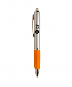 Classic retractable ballpoint pen with a soft rubber grip with a silver barrel, chrome plunger clip, and ring. Black medium point.
